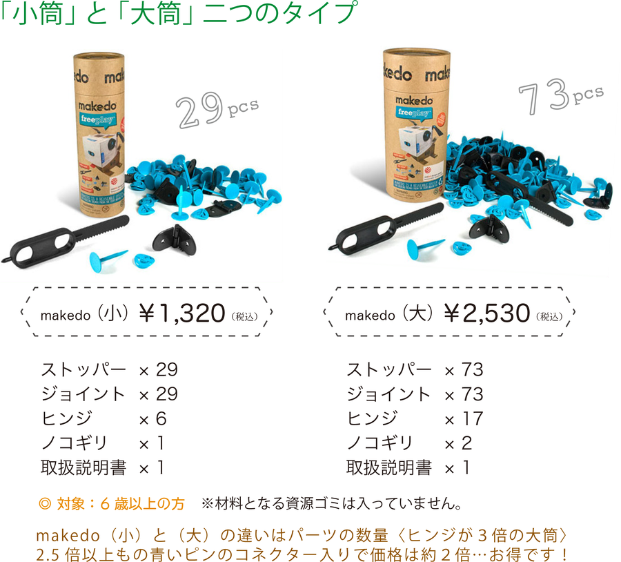 makedo(小)と(大)の違いはパーツの数量〈ヒンジが3倍の大筒〉
